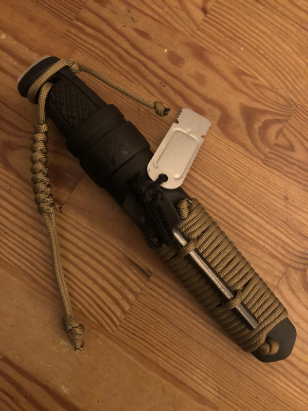 なんせ、休日・昼からビール飲みながら楽しくやってたので、途中の写真はございません。すみません。パラコードは家にあったのを使いました。アマゾンで普通に売ってると思います、探しましょう。ファイヤースターターは鹿番長さんの物を近所のホームセンターで買ってきました。1,000円位です。安い!ほう 棒と持ち手の接着が弱く取れそうだったので、瞬間接着剤(多用途タイプ)で固めました。これ大事かも・・ 隣に写っているCompanionさんはヘビーデューティーでない普通のタイプです。キャンプ料理用。